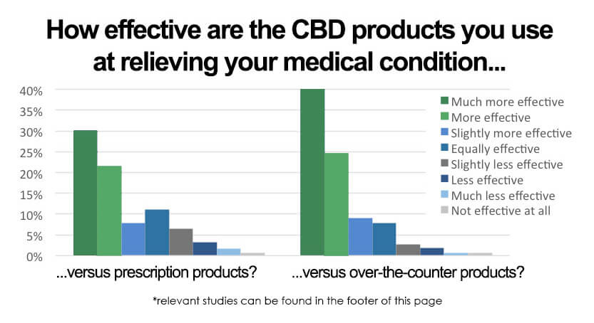 In fact, a recent study revealed that 60% of users say CBD is “more effective” than prescription medications. 75% found CBD more effective than over-the-counter products, as you can see below: